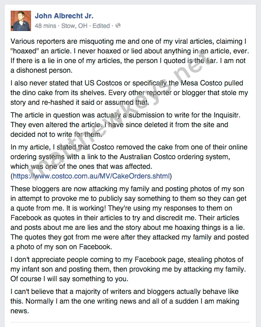 A story that has circulated widely on the Internet claiming a customer complaint had prompted the warehouse giant Costco to remove a dinosaur birthday cake design from its website has been deleted from the website The Inquisitr after it was revealed to be a hoax orchestrated by the reporter and his girlfriend.