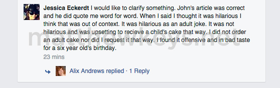 “John’s article was correct, and he did quote me word for word,” she wrote. “It was hilarious as an adult joke. It was not hilarious and was upsetting to receive a child’s cake that way…I found it offensive and in bad take for a six-year-old’s birthday.”