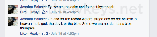 Eckerdt, the sole source for Albrecht’s story, said her Facebook comment about the cake being “hilarious” had been taken out of context.