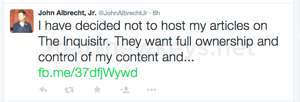 Since the piece was pulled, Albrecht has created several Facebook posts claiming a reader has made unspecified threats against him and his family. He also asserted that the article was removed from Inquisitr because he had deleted it after the website claimed “full ownership and control of my content.” (Treisman denies Albrecht deleted the article himself.)