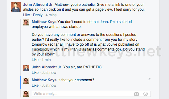 When reached via Facebook for comment, Albrecht wouldn’t say if he stood by his story. He called The Desk‘s inquiry into his story “pathetic” and compared it to that of a “stalker.”